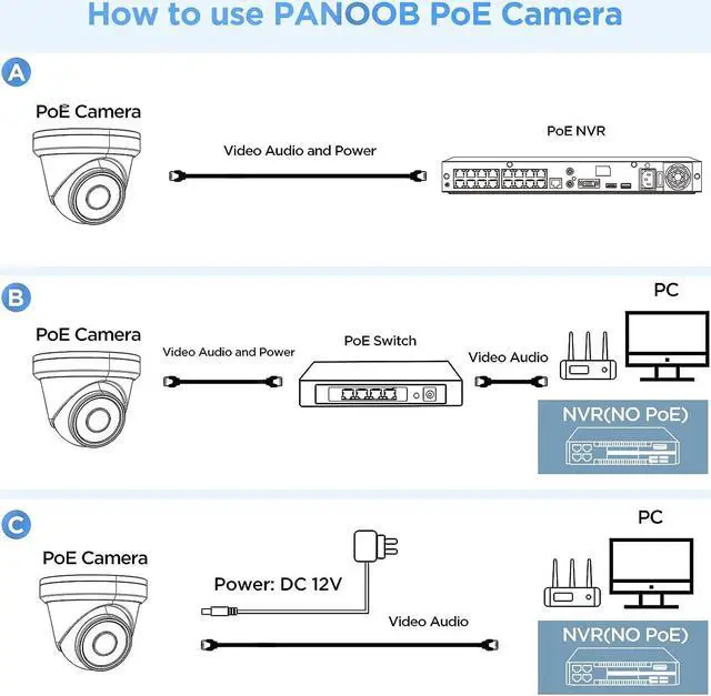 PoE: Our PoE camera built-in standard 802.3af PoE, compatible with all standard PoE NVR, PoE switch and PoE injector, no additional power adaptor required. One network cable transfer power, video, audio and data.