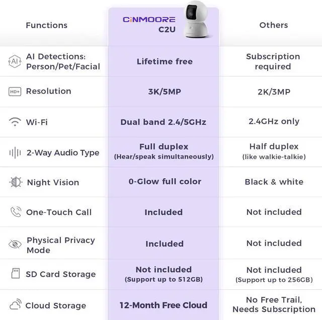 Home Camera w/ Free Al detections: Finally, a home security camera indoor that knows who's who! Stores 5 family faces locally w/ bank-encryption & 0 cloud uploads. Recognize family/strangers/pets/baby crying/smoke/gas alarms with no subscription fees. Spend an extra $20 Now and save $100 Later! Why pay $10/mth when privacy is FREE