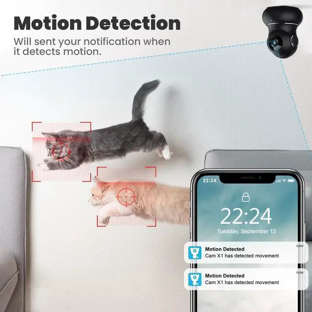 Motion Detection & Auto Movement TrackingThe cameras for home security indoor adopts Smart Perceive Technology to detect movements. Your phone will get an alert notification to push in time once motion is detected. Just open the APP to have a quick check on what happened, you won't miss any important movements! The Motion Detection sensibility can be adjusted by yourself. Meanwhile, when you turn on the function of auto movement tracking, the home camera will move as the object moves