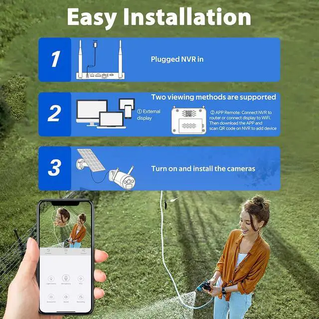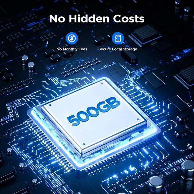 500GB Hard DrivePlayback to several years agoHDMI OutputHDMI output support external display6x Solar PanelsExtend the battery life of the camera6x Security CamerasSuitable for installation in doorways, entrance, garages, yards, corridors, warehouses, convenience stores, etc.4MP/2.5KRecord Clearer VideosNo WIFI NeedNot necessary to connect to the network when external display100% Wire-freeNo need for power and network cables when installingPIR Motion DetectionRecording will only be started when a heat source is detected2 Way AudioBuilt-in microphone and speakersAPP Instantly AlertCamera system will push an instant alerts to the APPMulti-device SharingMultiple people access monitored contentCustom Privacy ZonesSupport custom privacy area What does the 100% wire-free mean? No Monthly Fee - 2.5K Solar Wireless Security Camera System - 500GB Hard Drive hero-video Solar Powered Security Camera Support External Display Pre-installed 500GB hard drive 100% Wire-Free Color Night Vision Local Playback Interface APP Playback Interface Custom Privacy Zones 500GB Storage CCTV Security Camera System
