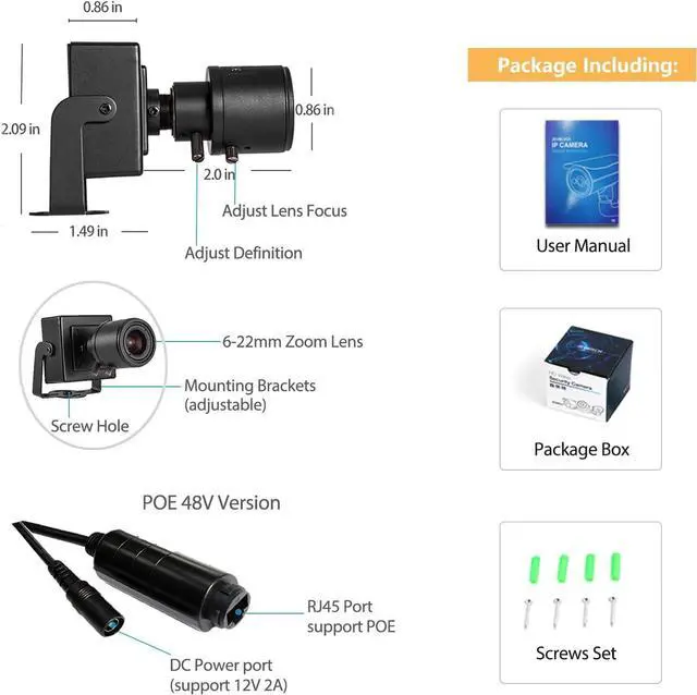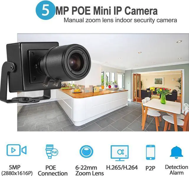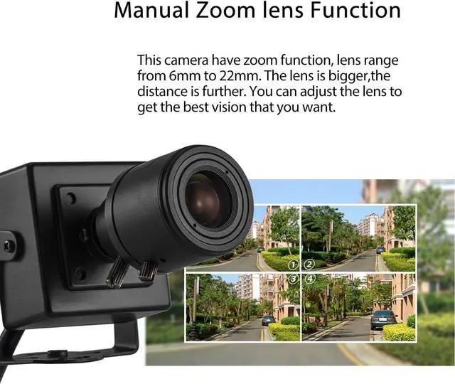 6mm-22mm Mini Manual Zoom Lens Design This IP camera has zoom function, the lens range is from 6mm to 22mm. The bigger the lens, the further the distance. The smaller the lens, the closer you can see and the wider the viewing range, you can adjust the lens as needed.