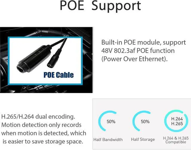 Save Storage Space, H.265/H.264 Double Encoding Compared with H.264, H.265 needs half the bandwidth to transmit the same quality image, and the same quality recording needs half the storage space. Motion detection only records when motion is detected, which is easier to save storage space than other cameras.