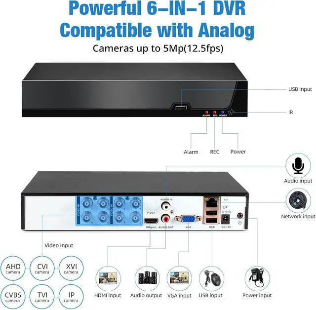 6-in-1 Hybrid 8 Channel DVR with 1TB Hard DriveThe expandable hybrid digital video recorder, combing the features of DVR/NVR, supports up to 8 pcs TVI, AHD,CVI, XVI ,IPC& Analog cameras.This 8 channel security recorder adopts advanced 1080p 5MP full HD technology, Whether it's day or night, it can provide excellent visual effects, making every detail in the monitoring area visible. So, you have full-range security camera choices for your property.