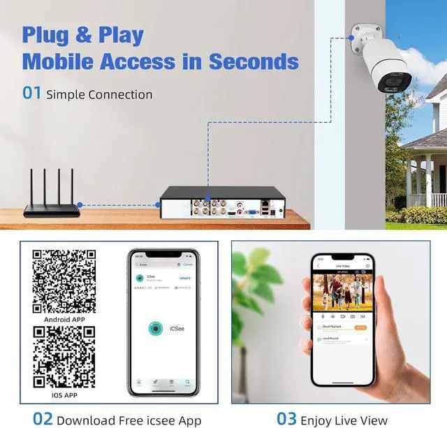 Instant Alerts & Remote AccessThe security camera system can detect anything unusual with the advanced algorithm and push real-time app notification and email alerts with snapshots, when there are motion events.Install download lcseeView free mobile APP through scanning QR-code or download from APP store.With the free APP, You Can Remote View or via Smart Phones, Tablets, Notebook or PC,Access the system directly to see the motion-triggered events and take actions at once to prevent the intrusion.