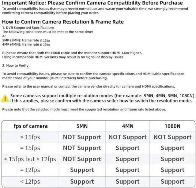 Please NoteWhen connecting the camera, please check if it is compatible with your camera based on the following parameters: 1.DVR supports 16* 5MN@12fps,supports cameras with frame rates not exceeding 12 and resolutions not exceeding 5MN,6 in 1 (AHD/TVI/CVI/CVBS/IP/XVI)Cameras.2.Support 16* 4MN@15fps,supports cameras with frame rates not exceeding 15 and resolutions not exceeding 4MN,6 in 1AHD/TVI/CVI/CVBS/IP/XVI )Cameras. 3.Support 16* 1080P@15fps (XVI), support cameras with frame rates not exceeding 15 and resolutions not exceeding 1080P.