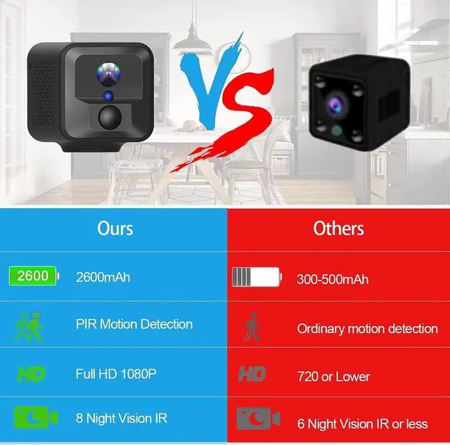 Upgraded Night Vision and Motion DetectionThe mini camera is equipped with 8 invisible infrared LED and advanced CMOS sensors, with night vision distances up to 18 feet, providing clear video even in complete darkness. When the spy camera detects a moving object, it will immediately push an alert message/picture to your phone.Also,the upgraded IR motion detection will better sense people/pets to prevent false alarms.