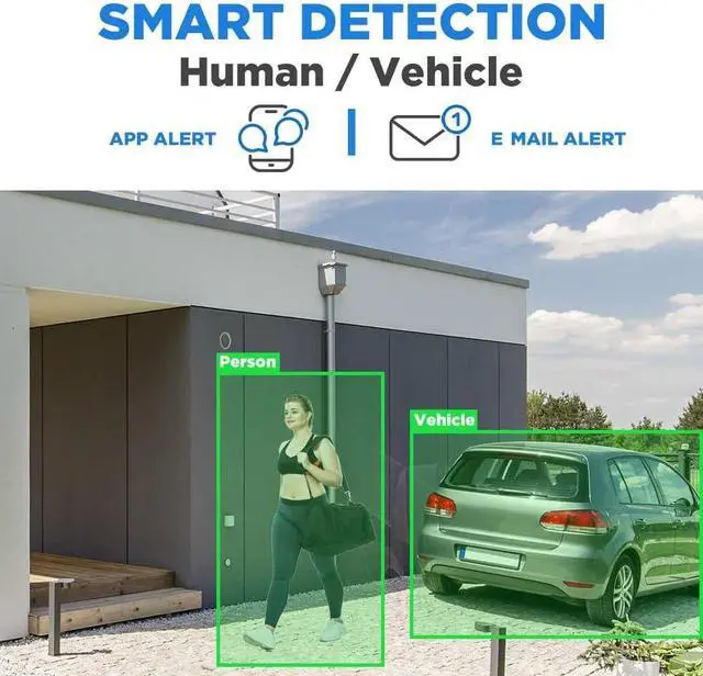 AI Human & Vehicle Detection - You'll instantly know if a person or a car arrives on your property with advanced AI motion detection technology.