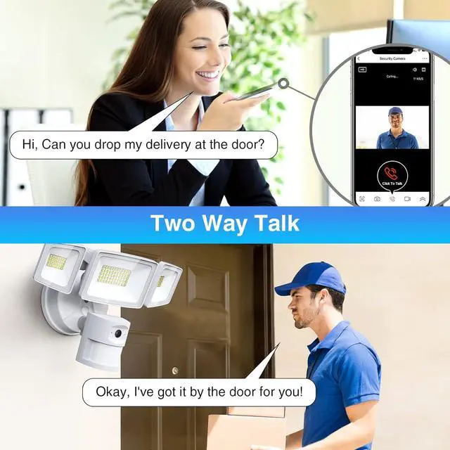[Two-Way Talk] The flood light security camera has a built-in microphone and speaker, which can provide 2-Way Talk, you could talk and listen to visitors, and also have a real time conversation with the courier even if you are not at home.