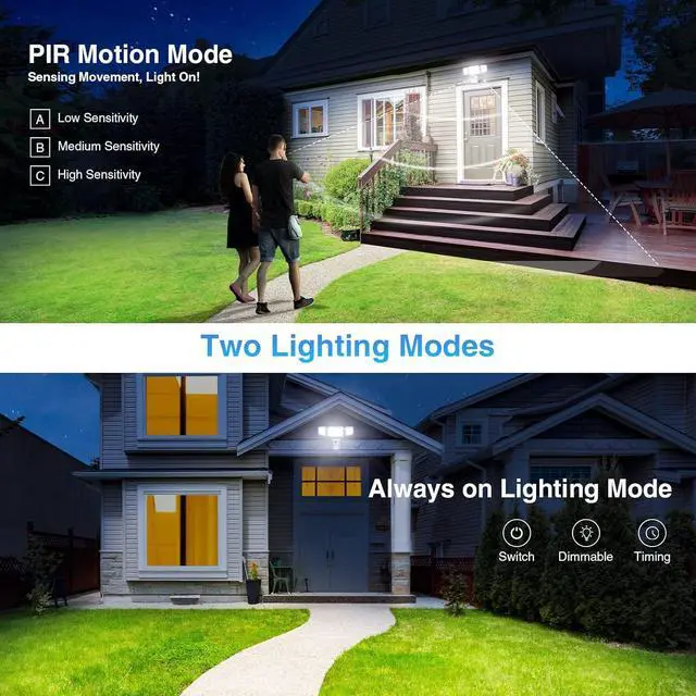 [2 Lighting Modes] 1.PIR Sensing Mode: when PIR motion sensor detects movement at night, the light is on; When people leave, the light goes out; 2.Always on Lighting Mode, the flood lights can be turn on/ off by app or switch. the brightness is 0-5500LM dimmable and it is with timing function. IP65 waterproof ensure it can withstand rain, sleet or snow weather.