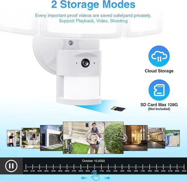 [Safety Monitoring] The floodlight cam wired is equipped with a 1080P HD camera, 125°wide angle, which can ensure detailed full color event recording even at night. The flood light camera support cloud storage and the Micro SD card up to 128GB(not included).