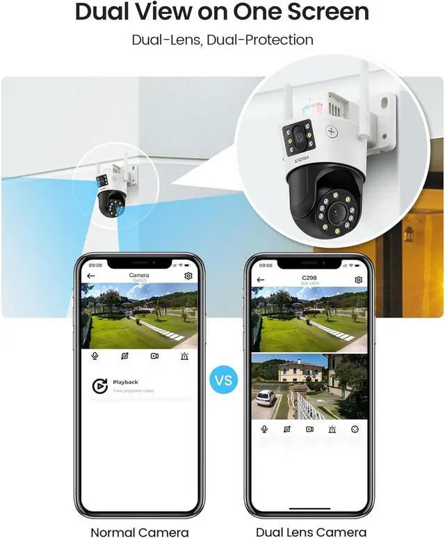 (5). [ More Stable WiFi Connection ] __ ZOSI dual-lens security camera offers flexibility with both 2.4 GHz WiFi frequencies, ensuring a stable and fast connection. Its IP66 waterproof design allows it to function seamlessly in extreme weather conditions. Perfect for open areas such as parking lots, garages, backyards, and front yards, this outdoor wired security camera is built to withstand various environmental challenges.