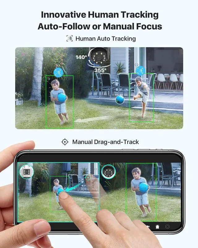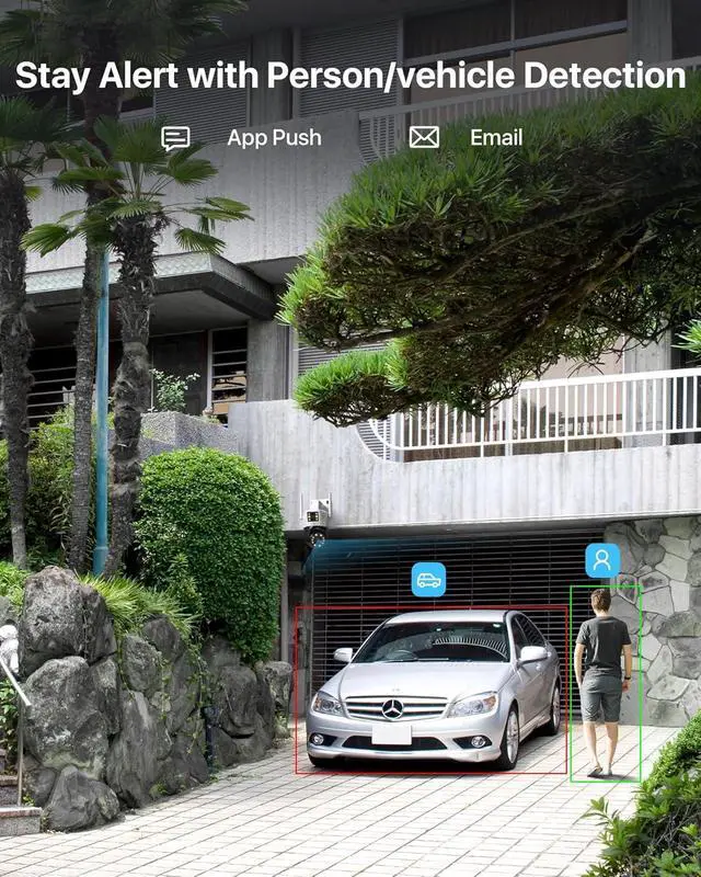 (2). [ AI Detection & Human Auto Tracking ] __ Leveraging advanced algorithms for intelligent detection, this ZOSI Dual-Lens WiFi PTZ Camera can automatically detect and distinguish between human and vehicle motion, initiating continuous tracking until the subject is no longer within the camera's line of sight. Upon detecting unusual activity, the motion-tracking cameras activate a white light alarm and instantly send push notifications and email alerts with screenshots.