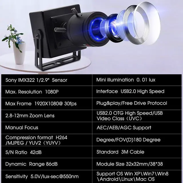 High Quality SONY IMX322 Sensor + 2.8-12mm Varifocal Lens - 2 megapixel webcam with Sony IMX322 Sensor is the high standard in terms of image quality and sensitivity performance. 2.8-12mm varifocal lens usb camera with IR-cut filter@650nm for true color day images/videos (Does not work with 850nm IR illumination),focus adjustable. Max.Resolution:1920(H)X1080(V): HighDefinition 1920X1080@ 30fps;1280X720@ 30fps;640X480@ 30fps. Perfect for high leval video system for personal or industrial.