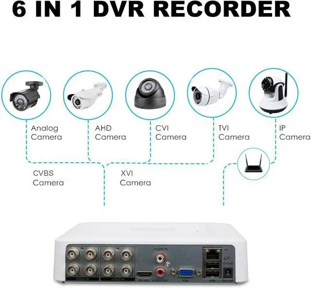 Hybrid 6 in 1 DVRThis 8CH 5MP-N DVR hybrid digital video recorder system is compatible 5MP-N/4MP/3MP/1080P XVI/AHD/TVI/CVI/CVBS/IP Camera. You could add 5 more different cameras and you can totally customize your unique security system. SUPPORT ONVIF-AGREEMENT.