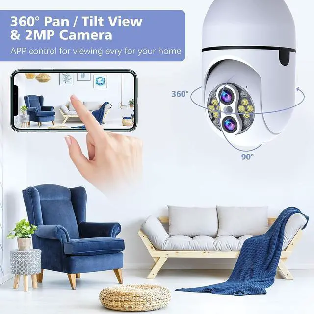 355°Pan 90°Tilt & Two-way audio : You can control the light bulb camera viewing angle by APP to achieve 355° horizontal rotation and 95° vertical rotation without blind spots ,so that your family and children are safer and assured. It allows you to keep in touch with your family or pets anywhere anytime with a built-in speaker.