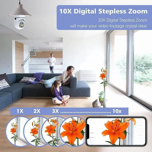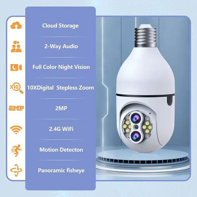 Dual Lens &10X Digital Zoom : The light bulb camera is equipped with dual lenses, and supports 10X digital Zoom controlled by the App, ensuring precise zoom-in or zoom-out for the finest details or wide viewing angle. It supports 24/7 HD video recording.