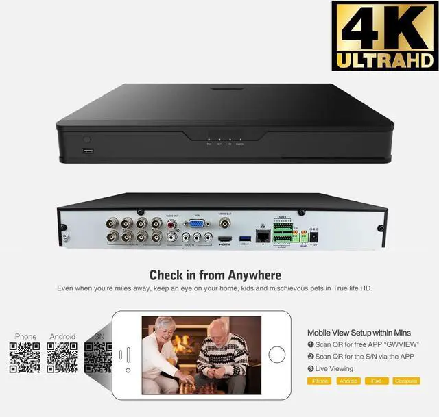 Ultra High Definition 4K Video - UltraHD 4K (8MP) is a 400% increase over standard 2MP(1080P) resolution. Record everything with sharper details with the high Pixel count (3840 x 2160) and be able to digitally zoom into far away objects without losing any quality. Worry-Free Two Year WarrantyPlug-and-Play. Just Connect them to your Monitor/TV, then you can monitor your home or business.