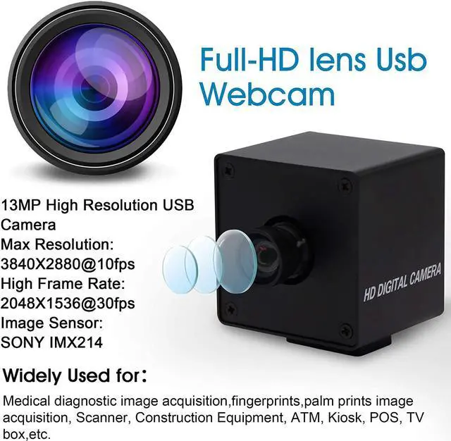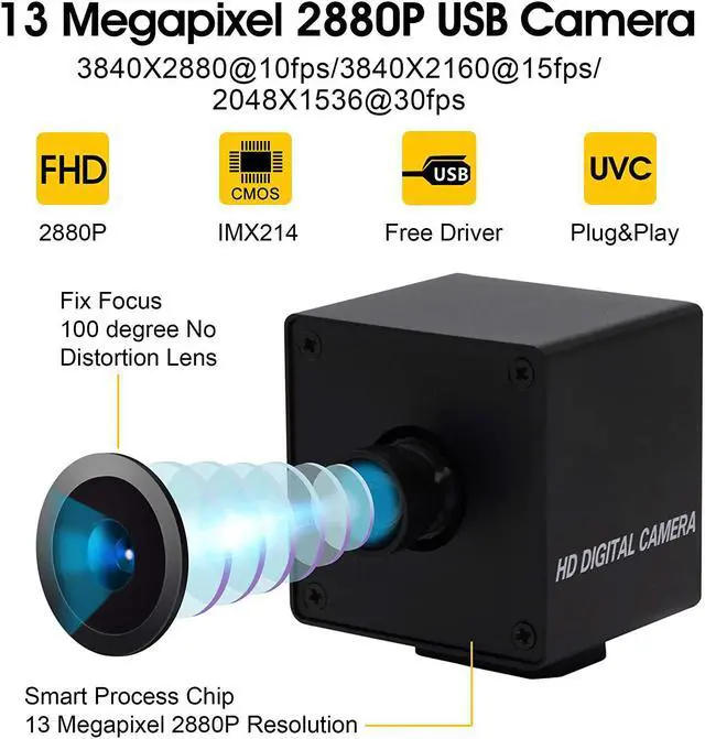 FULL HD 13MP 2880P USB WEBCAMThe streaming camera provides incredibly sharp 13 megapixel HD to capture crystal clear images and records 1536p/30fps video.Used for all kinds of machine as below: machinery equipment, all-in-one machine,POS equipment,STB,smart box TV BOX,advisement player,LED display,automatic vending machine,safety box,notebook,video door phone,MID,Tablet external,evaluator,Medical Equipment,on-the-spot law enforcement,etc.