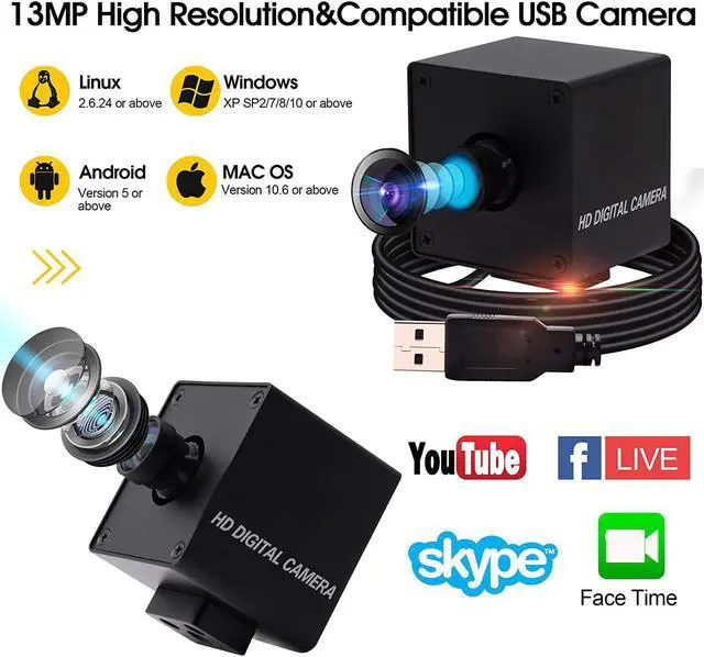 Wide Angle 100 Degree No-Distortion lens Usb Camera:Usb camera with aluminum mini case with 100 Degree No-Distortion lens,wide angle usb cameras can meet most capturing and video requirements,High resolution 13 Megapixel Camera USB with IMX214 sensor,Equipped with 3Meters usb cable, Support otg optional.