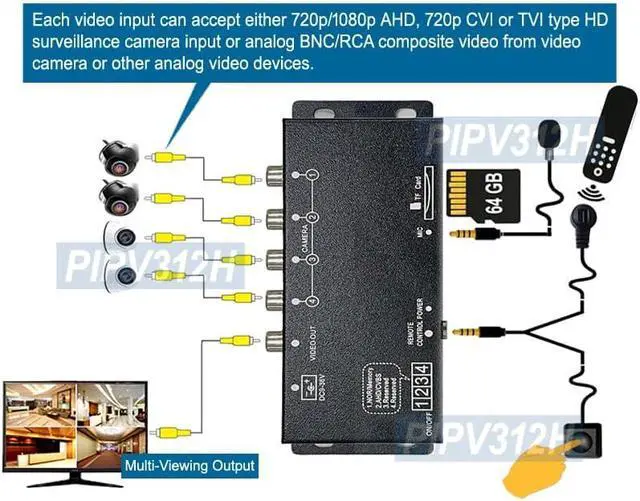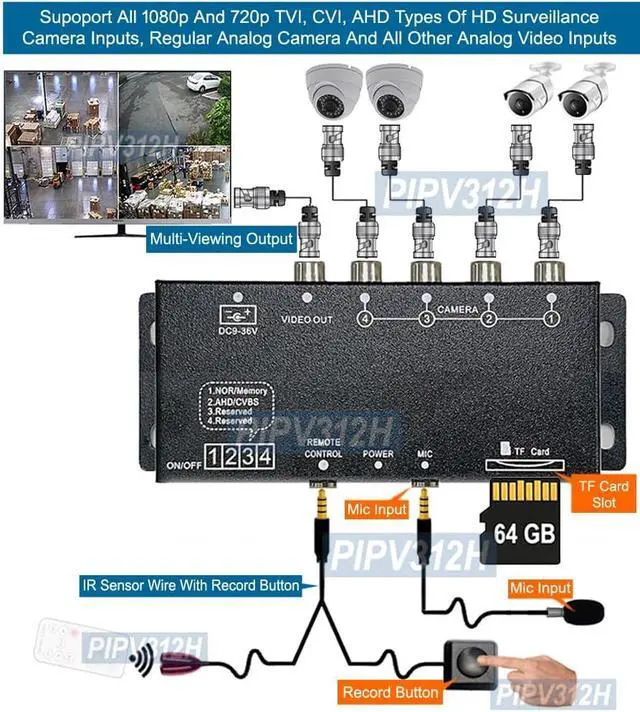Each video input can accept 1080p/720p TVI, AHD, CVI type HD surveillance camera inputs and any analog camera or other analog video devices.