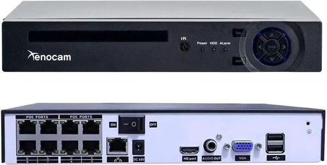 Xenocam NVR-P-8 8-Channel POE NVR Features 8CH Recording at 1080P/2MP, 3MP, 4MP and 5MP, As Well As Supports Hard Drive (Hard Drive Not Included). Delivers 8CH Power Over Ethernet providing power and data through single ethernet cable to each camera (Camera & cables not included).