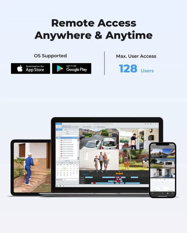 1Smart Person Detection2IP66 Weatherpfoof3Fast&Stable Connecetion4Scalable Storage1Software Management2Smart Playback3Remote Access4Intelligent Management5Stable Dual Management NVR8CH NVR (USNVR301-08S3-P8)Video OutputUp to 4K via HDMI and 1080P via VGA for this kit.Network BandwidthIncoming 160Mbps; Outgoing 64MbpsSynchronous Playback8 Channel Synchronous PlaybackStorage CapacitySATA × 1, Support up to 6TB Hard drive disk. (A 3TB HDD is preinstalled. )Compression FormatH.265, H.264, MJPEGWorking Temperature-10°C +55°C (14°-131°F)24Ports PoE Switch24* 100M Ports+ 2* Gigabit Ports+ 2* Combo SFP SlotsCamerasSmart POE Camera (HV-800S6).Video Resolution8MP(3840*2160)@15fpsLens2.8mm lens @ F2.0AudioOne-way Talk with Built-in MicrophoneNight Vision60ft/40 Meters; Infrared & Full-color Night VisionShell MaterialIP66 waterproof and dustproof; aluminum alloy shellWorking Temperature-30-(+60), -22°F~140°F, 10%-90%RH Making Security Easier Without Compromise 4K Ultra HD Resolution Smart Dual Illumination Smart IR technology Brilliant Color Night Vision H.VIEW Smart 8MP PoE Camera System Specifications