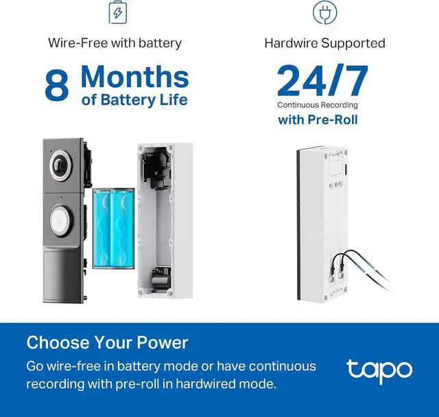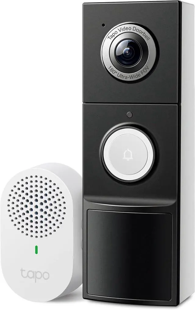 The Tapo D225 premium video doorbell elevates security and convenience to new heights. With this advanced doorbell camera, you can choose between up to 8 months of reliable battery operation or continuous monitoring via hardwiring, ensuring uninterrupted performance tailored to your needs. Enjoy unparalleled clarity with 2K QHD resolution, delivering stunningly detailed live views. The wireless doorbell offers a 180° head-to-toe angle view, capturing everything at your doorstep, while full-color night vision ensures no detail is missed, even in low light. The AI Detection system in this smart doorbell camera provides sophisticated person, package, and vehicle detection, delivering accurate and relevant alerts. Stay connected and communicate effortlessly with built-in two-way audio, allowing you to speak to visitors from anywhere. *: 1. microSD card sold separately. Actual storage capacity depends on the size of the microSD card used. 2. Cloud storage service available via Tapo Care subscription. 3. Compatible with Alexa and Google Assistant-supported displays. User experience varies based on connected services. 4. Chime is for indoor use only. 5. Battery life depends on recording time, live view usage, device settings, router specifications, and environmental factors.