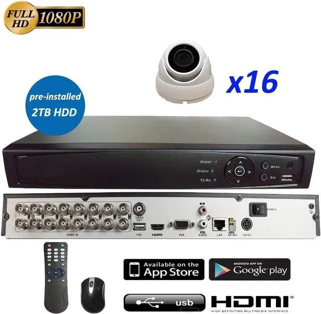 16CH HD DVR w/ 2TB HDD. DVR can connect 16 HD/SD cameras by using wired cable with BNC connectors and 2 IP Network cameras by using IP address. Triplex: Live / Playback, Record, Network. Standard H.264 Video Compression with low bit rate and better image quality. Support 2 x SATA HDDs (Each HDD can go up to 6TB Storage Capacity). Exceptionally strong password and anti hacking protocols to increase privacy and security. Snapshot, and Email notifications for real time protection.