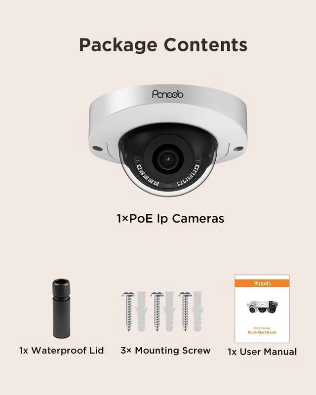 Main Stream25fps@5MP(2592x1944)/4MP(2592x1520)/3MP, 30fps@1080P/720PEffective Pixels2592 x 1944 OutputFocal length2.8 mm Fixed Lens Field of View110°Infrared Night VisionUp to 25 meters (82 ft)SoundBuilt-in MicrophoneVideo FormatH.265/H.264Working Environment -30-(+60), 10%-90%RHP2P Cloud ServiceYesPowerPower Over Ethernet/12V DC Power SupplyMin. Illumination0.01Lux F1.2(AGC ON), 0Lux IR onMediaCMS, Android, IOS PANOOB 5MP Wired PoE Security IP Dome Camera with Mic for Indoor Outdoor Use Reliable Connection with PoE Technology IP67 Waterproof for Outdoor Use 1-Way Talk with Built-in Mic Smart AI Human Detection 5MP Day & Night Real HD Vision Infrared Clear Day Night Vision 5 Megapixels HD Images Display 5MP PoE Security IP Vandal-proof Dome Cameras Specifications
