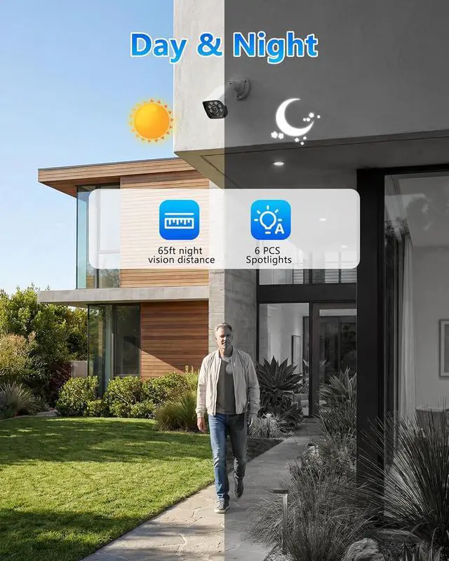 • 1080P Day & Night Surveillance: Each wired security camera delivers Full HD 1080P video with built-in IR LEDs. Automatic IR-CUT switching ensures clear color images during the day and sharp black-and-white night vision up to 65ft, securing your peace of mind day&night.