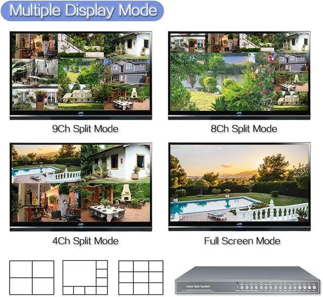 -Support 9 channels real-time video display with multiple display modes. -Support 2 channels video output and loopthrough video outputs. -Support digital zoom in/out. Support auto sequential video channel switching. -Support multiple video channe