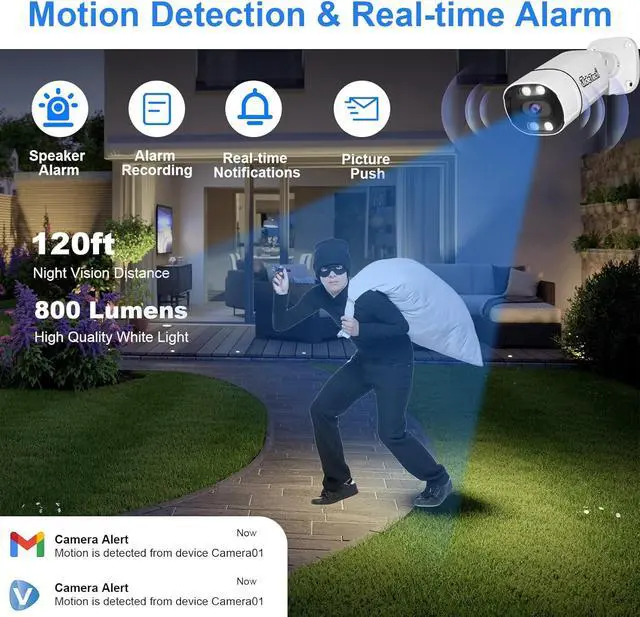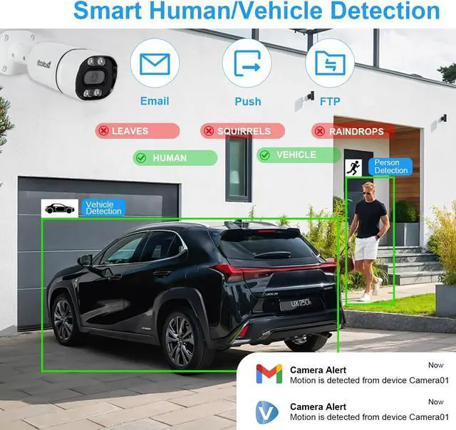 Human/Vehicle Detection & Intelligent Motion Alerts: JideTech 5mp poe ip security camera bullet poe featured advanced person/vehicle detection based on cutting-edge detection algorithms to accurately identify people and vehicles, minimizing false alarms triggered by animals, falling leaves, and more. When a person or vehicle enters the monitored area, the camera will automatically detect and send a real-time alert message to your cell phone
