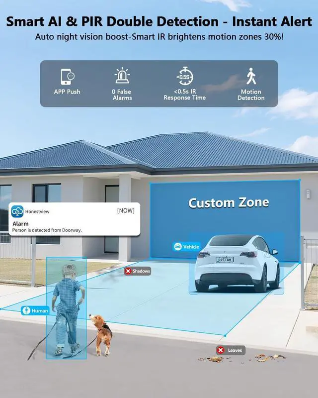 {All-in-One 10 HD Monitor} This 4K PoE security camera outdoor supports add up to 8 cameras up to 8MP/4K resolution. And wied outdoor cameras for home security comes with 1TB (up to 6TB). The 10 Inch Large Screen NVR provides you with Ultra Clear Video at the level of a Laptop Screen. {Auto-Track PTZ Camera System} The surveillance camera system has PTZ cameras that features Auto-Track . Mount the cameras of different sides of your property to cover it all. The cameras automatically track people, animals and vehicles, and automatically return to settable home point. {PTZ 360° Coverage} PTZ outdoor camera, you can pan, tilt and digital zoom. The camera rotates 355° with a tilt angle of -15° to 90°. The poe camera offers 5x Digital zoom. Day and night to protect your family. {2-Way Audio} You can keep in touch with your family when you miss them and want to talk to them anywhere and anytime. This security camera supports multiple users(up to 4) to view streaming video simultaneously. You can remotely live view or chat by high-quality two-way audio via APP. Just download the free Eseecloud APP from APP Store (IOS) or Playstore (Android) on smart-phone. {130° Ultra Wide-Angle Lens Equipped} Optical wide-angle lens with multi-layer lens, provides you about 130° wide viewing angle and reduces dead ends of surveillance areas. {4K Ultra HD} Super HD 8.0MP cameras Capture crystal clear videos day & night. The 4pcs infrared array LEDs allow you to get high-quality night vision up to 90ft, helping you to protect your property even at night. {Plug and Play PoE System} The camera kit comes with 60ft network cables, which allows for easy installation and set-up. After connecting the security cameras to the NVR ports, recording and live views can be seen within seconds via an HDMI monitor. {Free APP No Month Fee} Download the free app "Honestview" from App Store on your smartphone. With an internet connection, you can watch the videos remotely from anywhere on your phone (IOS&Android), PCs, or tablet.