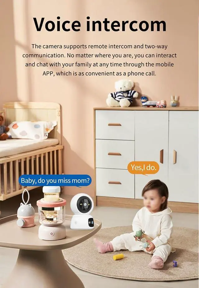 Wireless Connection,2-Way Audio IntercomBuilt-in high-fidelity microphone and speaker enables smooth 2-way voice intercom.You can remotely chat with family,soothe babies or interact with pets via the mobile app anytime,anywhere.