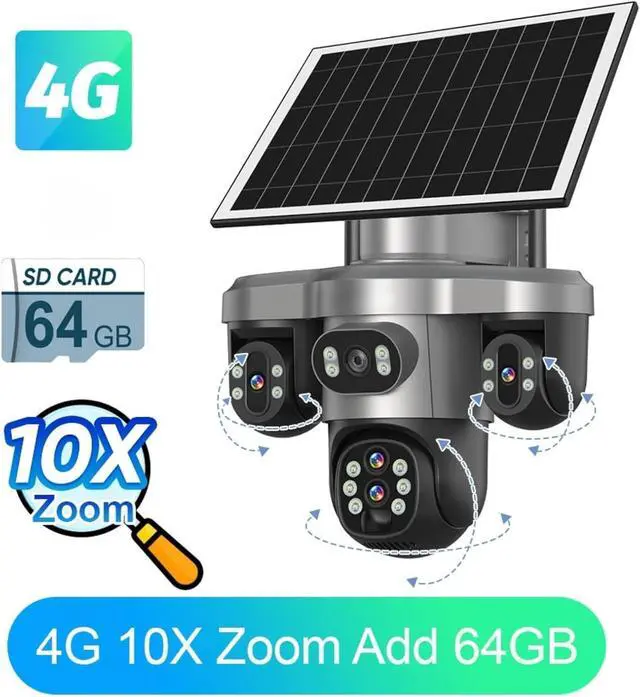10X Optical Zoom Three Screens Outdoor Surveillance Camera 4g Security 3 PTZ Lens with 64GB Card CCTV Automatic Tracking V380