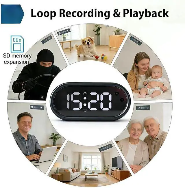 1080P Full HD Clock Camera with Enhanced Night Vision Function This clock camera adopts advanced image sensors, which can capture extremely clear ultra high definition videos. During the recording process, it can present sharp details and bright colors. Ensure that every image and video is clear and delicate. You can use it to capture every detail, making it easier for you to record your surroundings. The enhanced night vision function it is equipped with enables uninterrupted 24/7 real color visual experience, day and night.