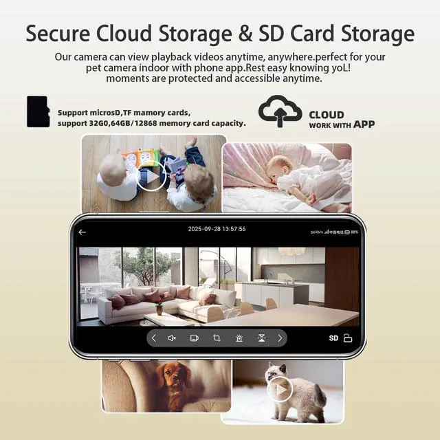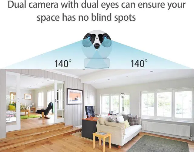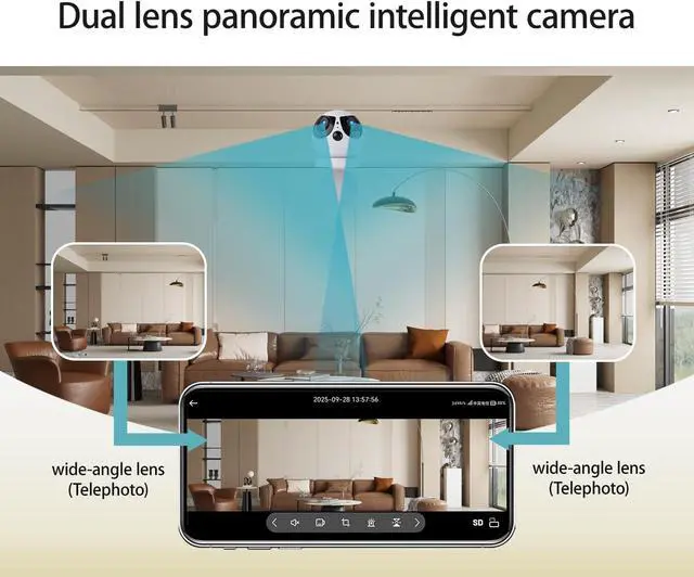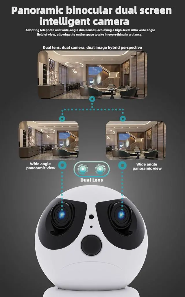 Seamless 180° Dual Lens Panoramic View - Advanced dual-lens stitching delivers near 180° ultra-wide coverage with no blind spots or separate screens; enjoy true full panoramic security camera monitoring without dead zones, plus flexible electronic PTZ (ePTZ) cruise patrol and optional one-to-two split screen display for customized viewing. Ultra-Low Power with Long-Lasting 3000mAh Battery - Battery powered design with efficient 3000mAh built-in rechargeable battery ensures extended standby time; compact and energy-saving for dual lens panoramic cameras, perfect for wire-free indoor placement with reliable all-day performance. Stylish Decor Meets Smart Security - Elegant, compact design doubles as beautiful home decor while functioning as a powerful 2K security camera; blends seamlessly into any room as a decorative wireless camera that provides discreet yet effective surveillance. Crystal-Clear 2K Resolution & Built-in SD Card Slot - True 2K (3 million pixels/3MP) high-definition video captures sharp details day or night; supports local storage via built-in SD card slot for easy recording and playback on this panoramic WiFi security camera. Two-Way Audio & IP54 Protection - Built-in microphone and speaker enable clear two-way talk/intercom for real-time communication; IP54-rated dust and splash resistance adds durability, making this battery powered indoor security camera versatile for various environments.