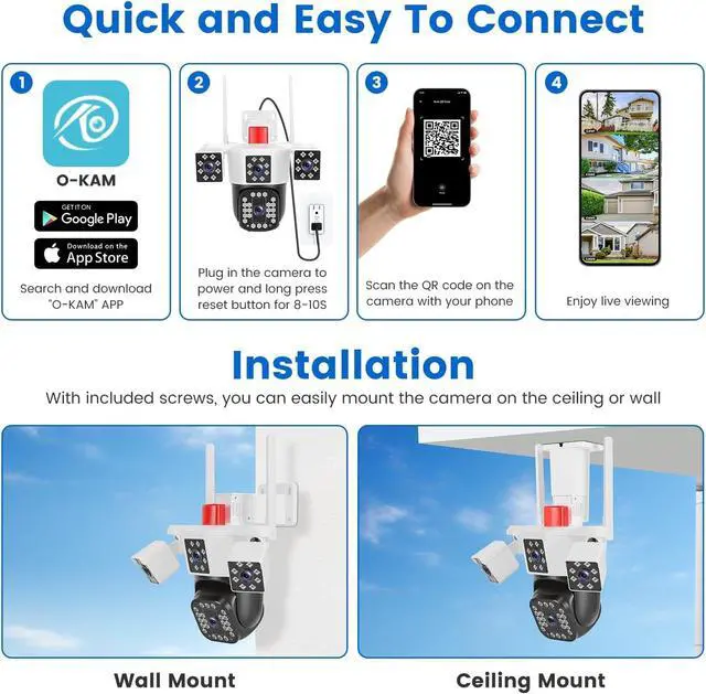 Easy 2.4G WiFi Setup & Full App ControlGet connected in minutes. Simply power the camera, connect to 2.4GHz WiFi, and mount it. Through the dedicated app, manage everything: set schedules, review playback, adjust detection sensitivity, control the siren, and customize monitoring zones with ease.