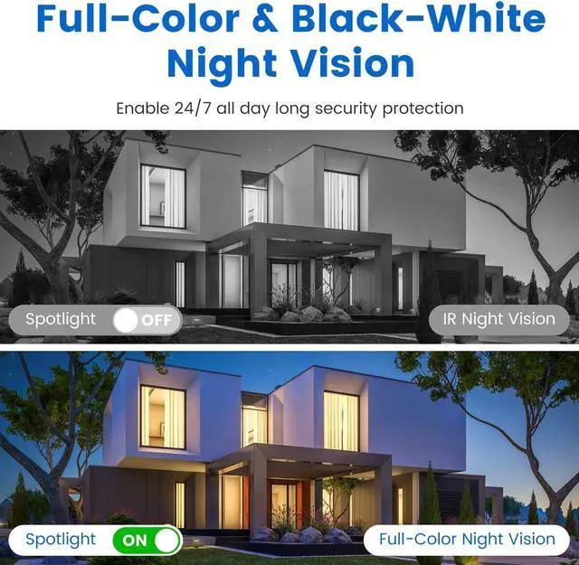 See Clearly Day & Night with Auto TrackingOur 4-lens security camera features with high-precision motion detection technology, capable to auto tracking the moving subject or people in the area you customized, send real-time notifications to phone and make the pre-recording siren alarm. Furthermore, built-in LED and IR lights offer both full-color and black & white night vision depending on the App settings, ensuring uninterrupted surveillance around the clock.