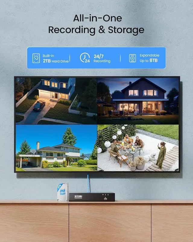 (3). [ Flexible Recording Modes for Each Camera ]__ The ZOSI NVR supports four recording modes: continuous 24/7 recording, scheduled recording, motion-triggered recording, and overwrite recording. Each camera can be configured independently to match different monitoring needs, and recorded footage can be easily backed up via USB.