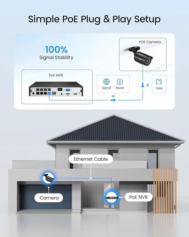 (5). [ Plug & Play PoE Setup, 16CH Expandable ]__ Designed for easy installation, this plug-and-play PoE system uses a single Ethernet cable to transmit both power and videoproviding a more stable and reliable connection than wireless systems. With an optional PoE switch (not included), the 8-port NVR can be expanded up to 16 channels, allowing you to add more ZOSI PoE cameras as your home or business security needs grow.