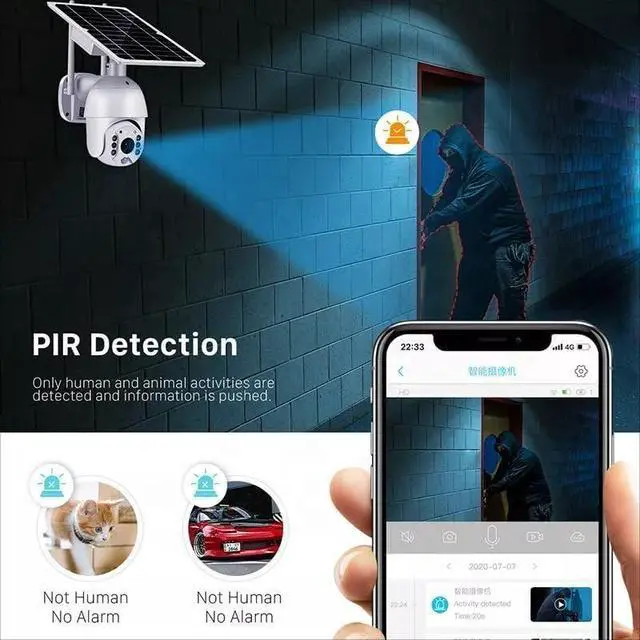 4G/WIFI+PIR+AI humanoid detection, 2.4G WIFI and 4G network, ensuring stable network connection even in remote farms without WIFI coverage. The upgraded PIR infrared sensing module, combined with artificial intelligence human recognition algorithm, intelligently filters false alarms, reducing the false alarm rate by 95%. When someone invades, an alert will be immediately triggered: real-time notifications will be pushed to your mobile application