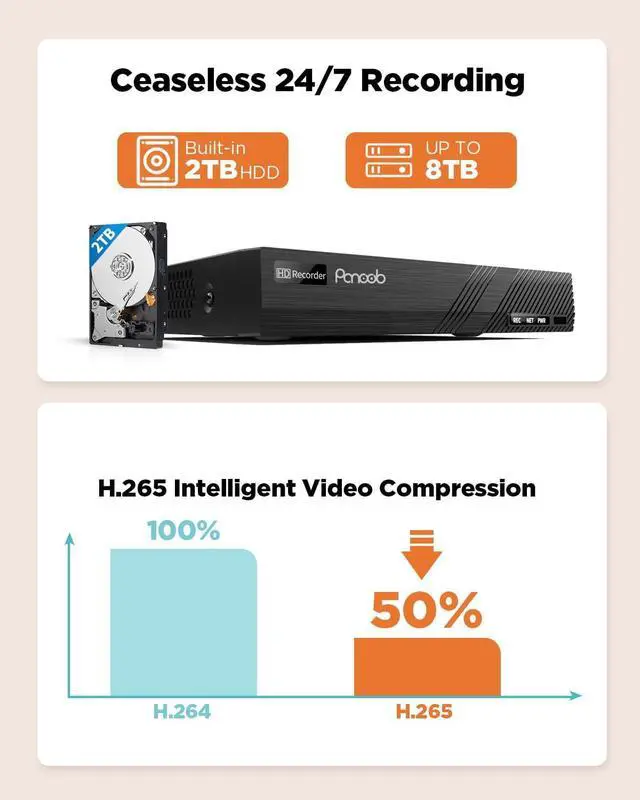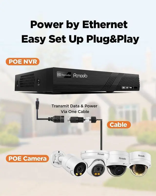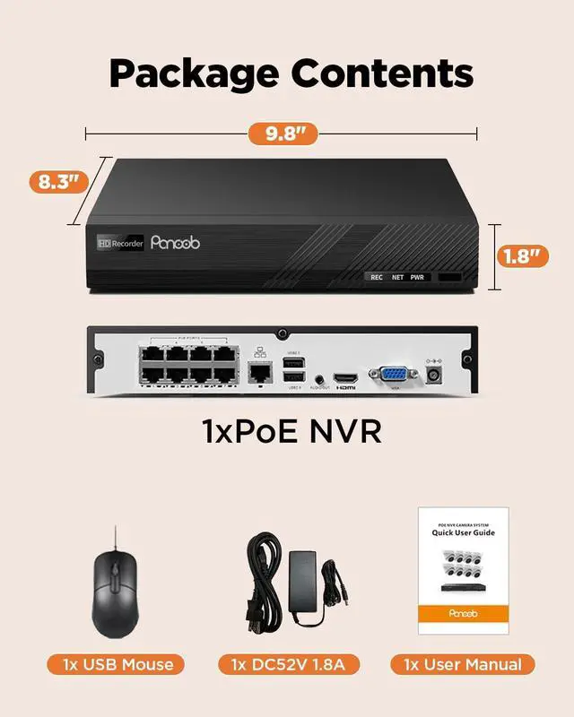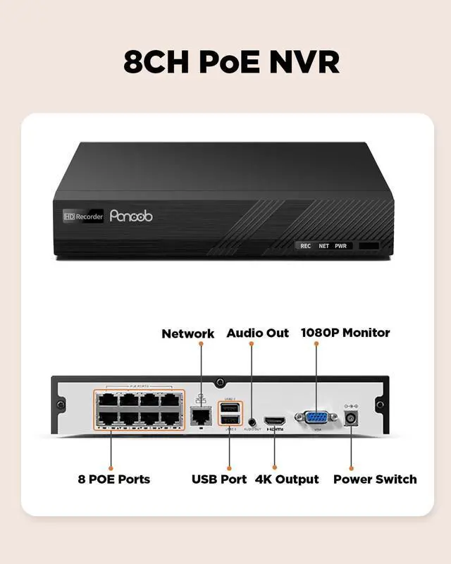 1X PANOOB 4K H.265 8 Channel NVR & 8 PoE Ports, Built in 2TB HDD