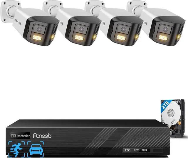 PANOOB 4K PoE Dual Lens Security Bullet Camera with Smart Color Night Vision, 4X 8MP Indoor/Outdoor IP Cameras, Two-Way Audio, Bundle with 1X 4K H.265 8 Channel NVR & 8 PoE Ports, Built in 2TB HDD