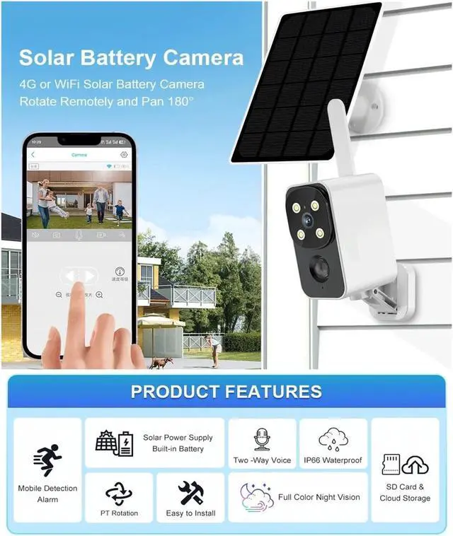 4G/WiFi dual network compatibility + 180° adjustable viewing angle, flexible deployment in multiple scenarios: Supports 2.4G WiFi and 4G dual-mode networking, suitable for scenarios without network; Horizontal 180° electric rotation + 100° manual adjustment, paired with a 4mm lens, 180° field of view angle, with no blind spots for indoor and outdoor monitoring.