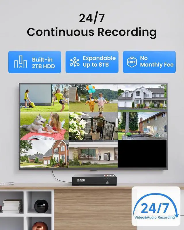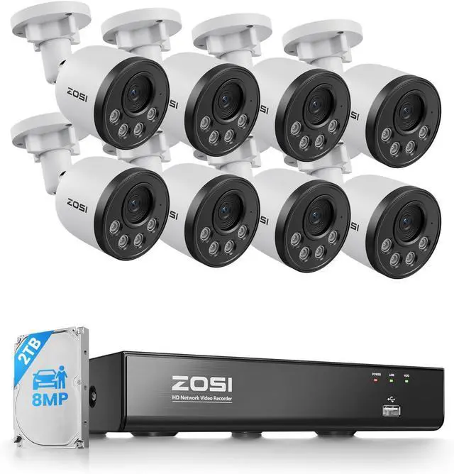 1Person Vehicles Detection2One-Way Audio3Threat Alerts4Smart Playback 5Privacy Guard1Plug & Play224/7 Continuous Recording3Remote Access4Perfect for Any Scenario5Package Contents NVR8CH 4K Network Video RecorderConnectionEthernet cable connectionCompression FormatH. 265+/H. 265Video OutputsHDMI, VGARecording ModeManual, Scheduled, Motion DetectionPlayback ModeInstant, Normal, Event, Alarm HDD Capacity1× internal portNetwork ProtocolIPv4, TCP/IP, DDNS, DP, DHCP, P2P, NTP, SMTP, Http/Https, RTSP, OnvifCamera4K PoE IP Bullet CameraImage Sensor1/ 2.7" CMOSLensf= 4.0 mm Fixed, F= 1.6F rame Rate20fpsNight VisionBlack & White IR Night Vision (100ft) Built-in MicrophoneSupportedAI Smart DetectionHuman/Face/Vehicle DetectionWorking Environment-10°C +55°C (14°-113° F), IP66 Waterproof ZOSI 4K PoE NVR Security Camera System C180 SmarterAlerts, Fewer False Alarms Never miss important sounds with always-on audio Swift Alerts to Action Smart & Easy