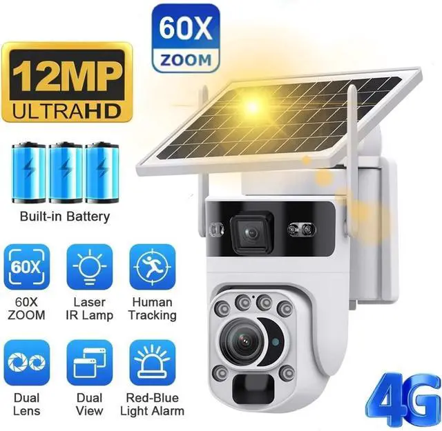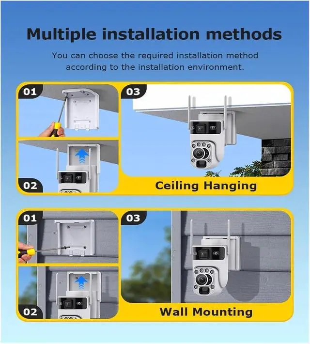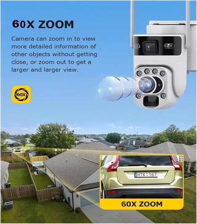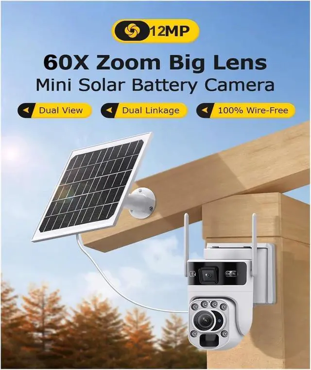 Dual-lens dual-screen + 12 million pixels, clear monitoring both near and far: Equipped with 2mm wide-angle + 5-50mm 60x telephoto dual lenses, 12 million pixel ultra-clear imaging. Switch between close-up panoramic coverage and distant detail capture with one click. 360° field of view with no blind spots.