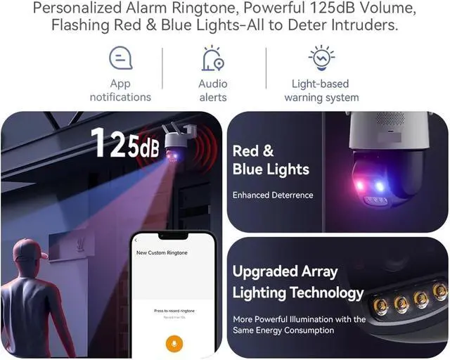 Precise human and vehicle recognition + 125dB sound and light alarm, full security deterrence: Intelligent differentiation between humans and vehicles. After triggering intrusion and out-of-line detection, the red and blue warning lights flash + high-decibel alarm to deter the intruder, and multiple-end alerts are simultaneously pushed, ensuring early detection of potential risks.