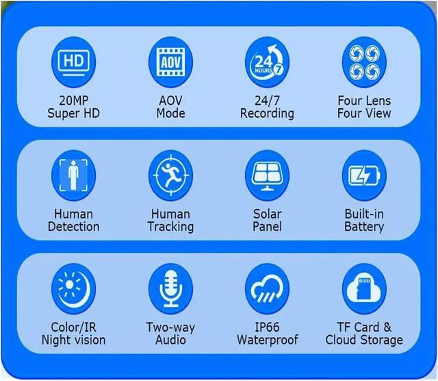 Four cameras and four screens + 20 million pixels, 360° panoramic without blind spots monitoring: Equipped with a multi-focal lens combination of 2.8mm + 4mm, the four screens display the same picture simultaneously, covering open areas such as courtyards and farms, with clear details of both near and far.