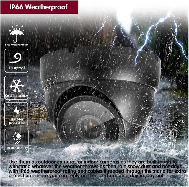 IP66 Waterproof Metal Dome:Constructed with a robust metal dome and IP66 rating, this camera withstands harsh weather conditions.